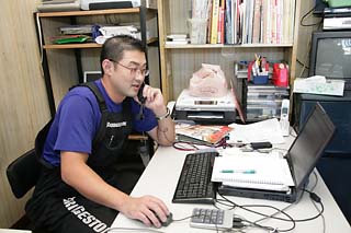 次々とかかってくる電話を受ける足立泰則さん(36歳)の声は軽快である。