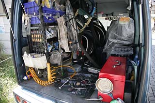 サイクルピットは、自転車の各種トラブルに、電話1本でかけつけてくれる自転車の出張修理専門店だ。電話をかければ基本的に当日、小回りのきく車に修理道具を積んで駆けつける。車はかなり細い路地でもスイスイ入っていけるほどコンパクトだが、修理工具に約400の部品まで積み込まれていて、ちょっとした自転車店より品揃えがよさそう。