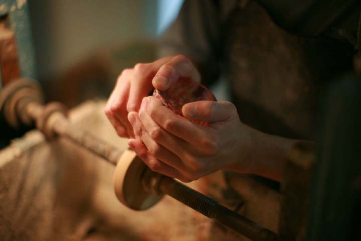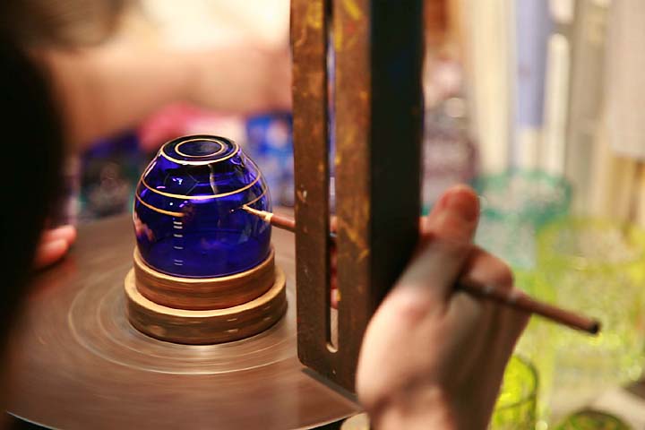 グィングィングィン‥‥‥ジーッジーッ。回るグランダーの前で、透明にきらめくクリスタルグラスに人造ダイヤモンドの刃を当てる。若社長が入れた斜めのカットを受け、交差する縦のカットを、澤口智樹さん(33歳)が入れて行く。