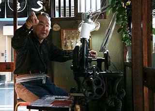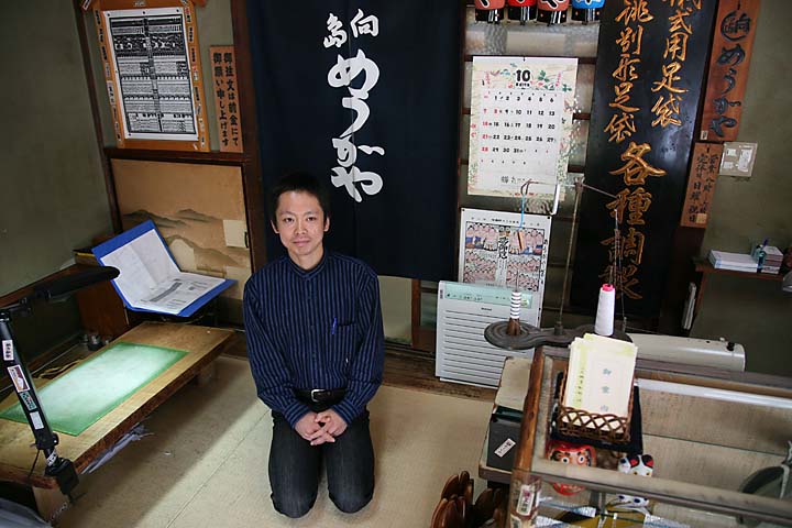 「子どものころから、細身の足袋をきれいに履きこなしている方を見かけると、ああいいなあと思っていました」と、石井健介さん(30歳)が言う。めうがや6代目にあたり、この道10年、ベテランですねと言うと、いえいえこの世界ではまだまだですと返ってきた。