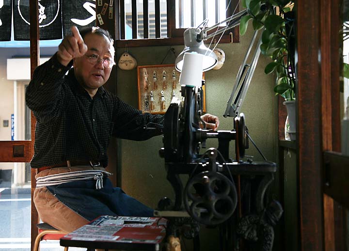 昔の足袋屋はお客様の注文を聞いて、外部の職人に仕事をふりわけ取りまとめる役目だったが、ここめうがやは現在はすべてを一手に引き受ける。