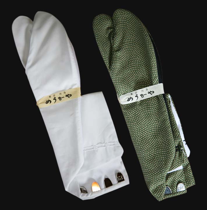 鮫小紋(既製品)4,300円。めうがやの足袋は細身でつま先のつんとした姿が特徴。白足袋(既製品)3,360円〜。1番上のコハゼにはめうがやの刻印。誂え足袋(6足36,960円〜)。名入れ可。