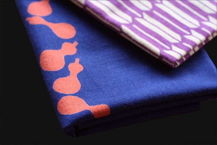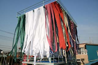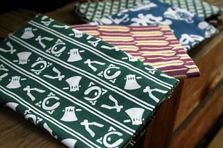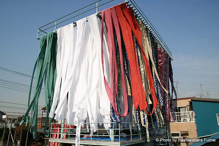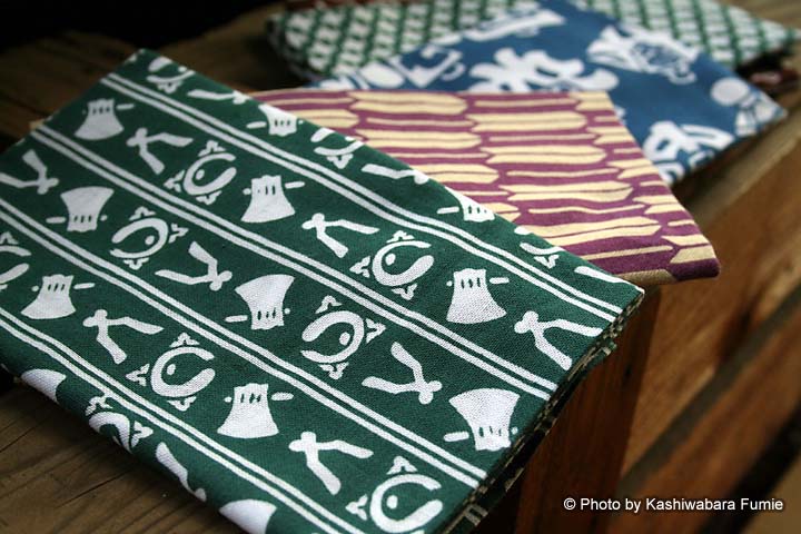 二関さん自身は、仕事のとき頭に巻くほか首もとに巻いて使う。おしゃれとしてですかと聞くと「それもありますが、夏涼しくて、冬暖かいので」と言う。さらにからだを洗うのも好きだ。「てぬぐいは使い込むとモサモサしてきて『堅い』と『柔らかい』の中間で気持ちいいんです」。年齢的に多い、友人の出産祝いに、自分の染めたてぬぐいと同布で作られた腹掛けをセットにして贈るのも楽しみのひとつ。わざわざ「かまわぬ」(てぬぐい専門店)で購入し、ラッピングしてもらって贈る。吸汗性のよいてぬぐいは赤ちゃんに最適。「喜んでくれます」。
