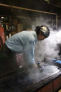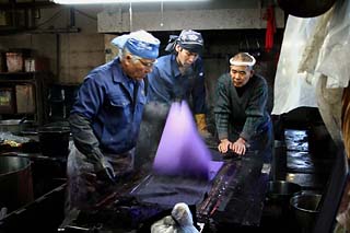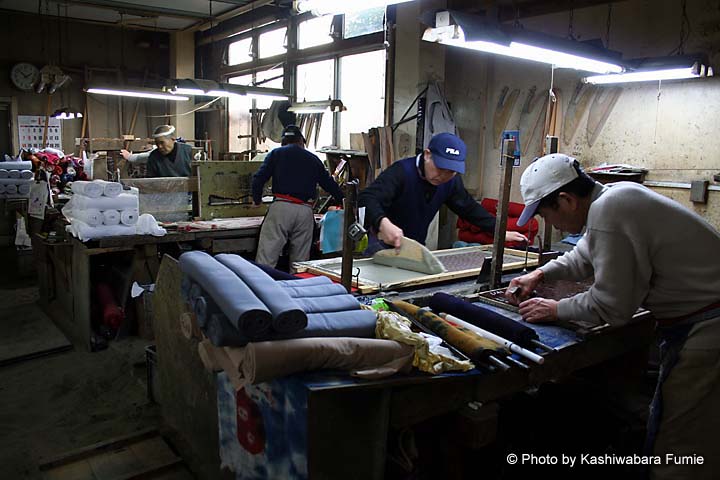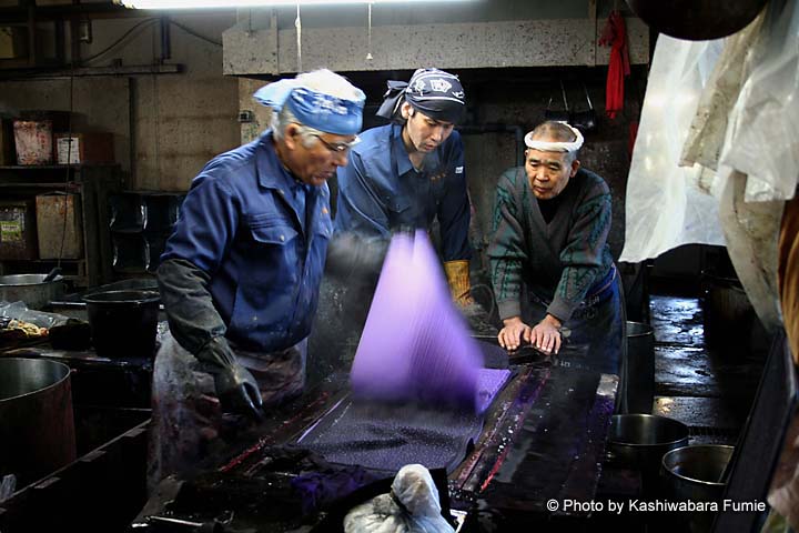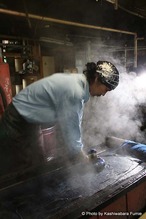 もくもくと白い湯気の立ちのぼる染料のなかでテキパキと男たちが立ち働く。バシャバシャと大きな水音が聞こえるほうに目をやると、染め上がったもめん生地が勢いよく洗いあげられて行く。ついさっき、糊(型)付けが始まったばかりの白生地がみるみるうちに色鮮やかな反物となり、あっという間に青空のもとにはためく。想像以上に速いスピード感に驚いた。染料がしみついた床や柱から染料の匂いが立ち込め、工場内は活気にあふれていた。